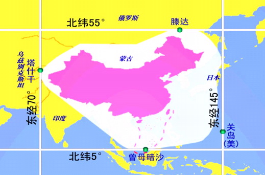 | “北斗”卫星定位导航系统是我国自主研制的区域性卫星导航定位系统。服务区域为东经70度至东经145度,北纬5度至北纬55度。服务区域如下图所示: